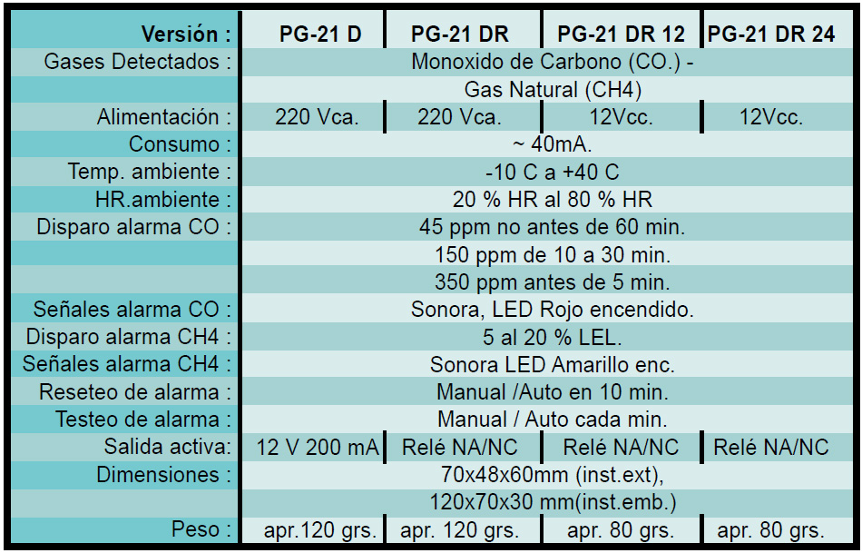 - Alarma luminosa individual (Verde: Normal, Amarillo: CH4, Rojo: CO).